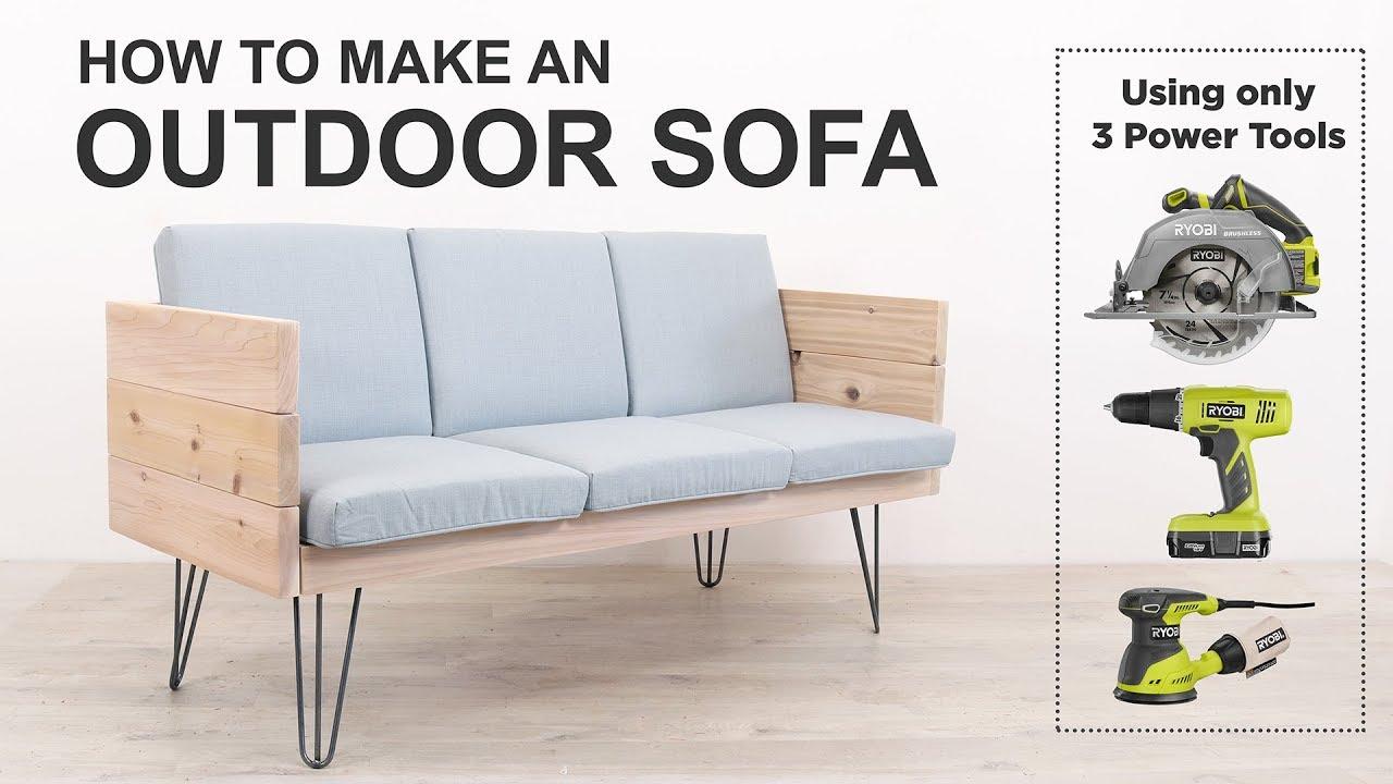 This DIY Outdoor Sofa is easy to make and only requires three basic power tools. I used a circular saw, cordless drill, and orbital sander to cut and assemble 2×6 lumber into this Outdoor Sofa. I used ready made outdoor seat cushions that I bought from Home Depot which means that no sewing is required.